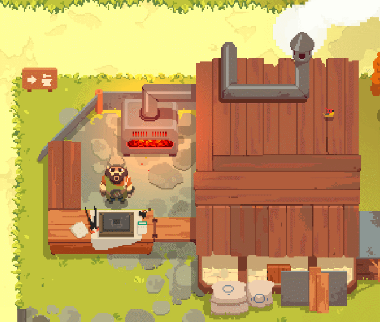 A sua loja começa com um design modesto, suficiente para vender as suas primeiras peças e começar a aquecer o mercado de Rynoka. Você é responsável por expor os produtos e estipular o preço de cada um, tendo apenas uma leve ideia de quanto ele deveria custar.